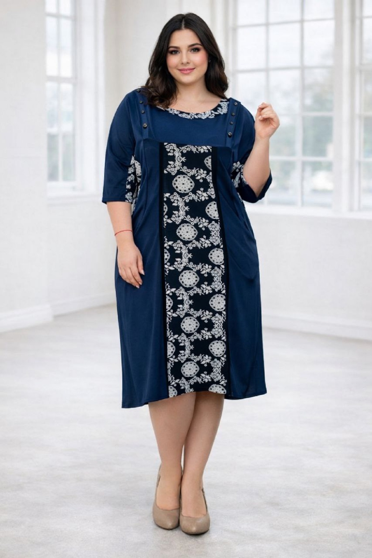 Опис: Елегантна сукня Грація з трикотажу джерсі та кольоровим принтом з рукавом три чверті. Кольорові вставки нижче грудей і в області горловини роблять витонченішу фігуру, візуально подовжуючи силует.